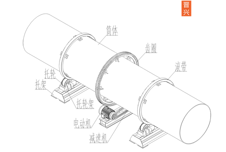 a.托架部分:托架部分包括前托架和后托架,其固定于相應的地基上,用于支撐筒體做定位旋轉。前后托架均由托架、托輪架、托輪組成。安裝時可通過調整前后托架上兩托輪的間距,對設備高度及角度進行調整。